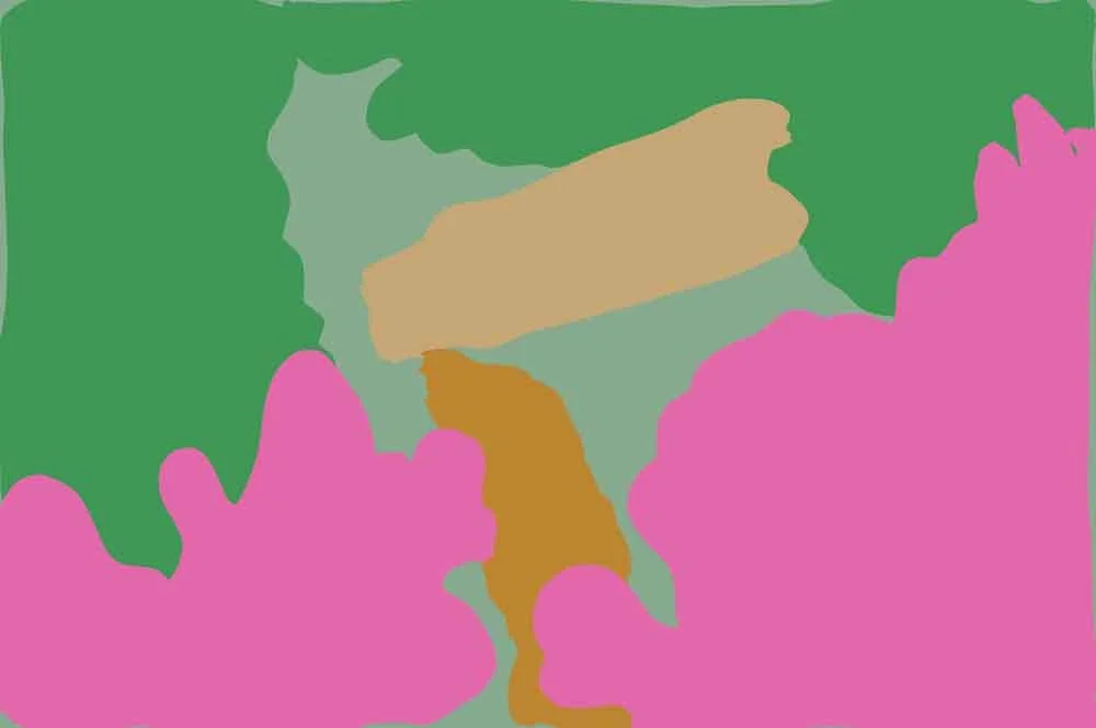 When I first look at this picture, the first thing that strikes me is that beautiful frothy tangle of pink blooms, and I see them as two big masses. So that's our first two shapes—there's kind of a collection of them. A nice organic shape, big organic shape in the bottom left and another one in the bottom right.